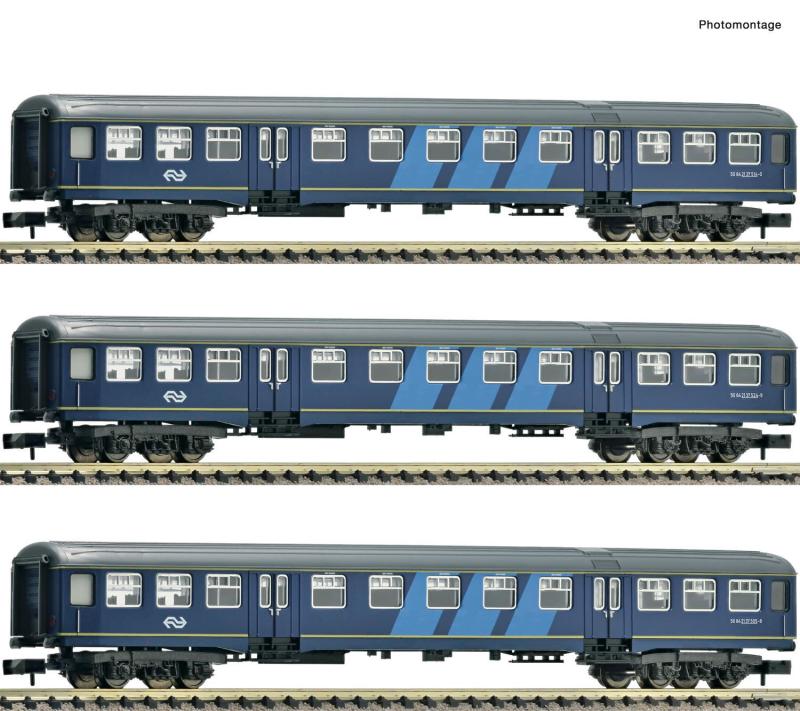 Wagenset mit drei Personenwagen 2. Klasse, Bauart Plan W, der Niederländischen Staatsbahnen. Ausführung mit hellblauen Schrägstreifen Die Reisezugwagen der Bauart „Plan W“ wurden ab 1966 bei Werkspoor in Utrecht gebaut. Die erste Serie von 24 Wagen wurde speziell für den grenzüberschreitenden Verkehr nach Deutschland und Belgien entwickelt. Die restlichen Waggons wurden bis 2003 im Binnenverkehr eingesetzt. Einige Fahrzeuge sind bei Museumsbahnen erhalten geblieben. Technische Daten: Allgemeine Daten Innenbeleuchtung Artikelnummer 944501 nachrüstbar Mit Inneneinrichtung ausgestattet Schacht NEM 355 mit KK-Kinematik Abmessungen Länge über Puffer 495 mm Hersteller: Fleischmann