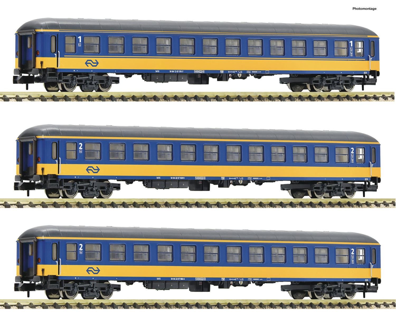 Wagenset mit drei Schnellzugwagen, Typ ICK (ex Bm 235, DB AG), der Niederländischen Staatsbahnen Das Set besteht aus einem Schnellzugwagen 1. Klasse und zwei Schnellzugwagen 2. Klasse. Einsatz: nationale Schnellzüge Bei den von den Niederländischen Staatsbahnen eingesetzten Fahrzeugen handelt es sich um ehemalige deutsche Fernverkehrswagen. Die ICK-Wagen waren in Einheiten von drei Wagen eingeteilt. Ein Zug bestand aus meheren Einheiten. Die ICK-Züge waren von 2002 bis 2009 in Betrieb. Technische Daten: Allgemeine Daten Innenbeleuchtung nachrüstbar Artikelnummer 944701 Mit Inneneinrichtung ausgestattet Schacht NEM 355 mit KK-Kinematik Abmessungen Länge über Puffer 495 mm Hersteller: Fleischmann