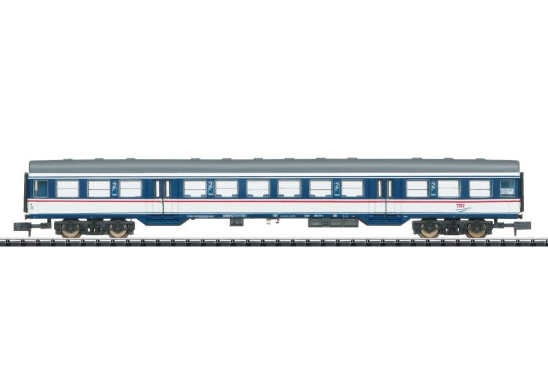 Vorbild: Nahverkehrswagen 2. Klasse (Betriebsnummer 50 80 22-35 956-8) mit Steildach der Train Rental GmbH (TRI).Betriebszustand um 2021. Modell: Formvariante erstmalig mit Steildach. Mit Kinematik für Kurzkupplung. Vorbereitet für den nachträglichen Einbau einer Innenbeleuchtung.Länge über Puffer 165 mm.Die dazu passende Innenbeleuchtung: 66612 LED-Innenbeleuchtung.
