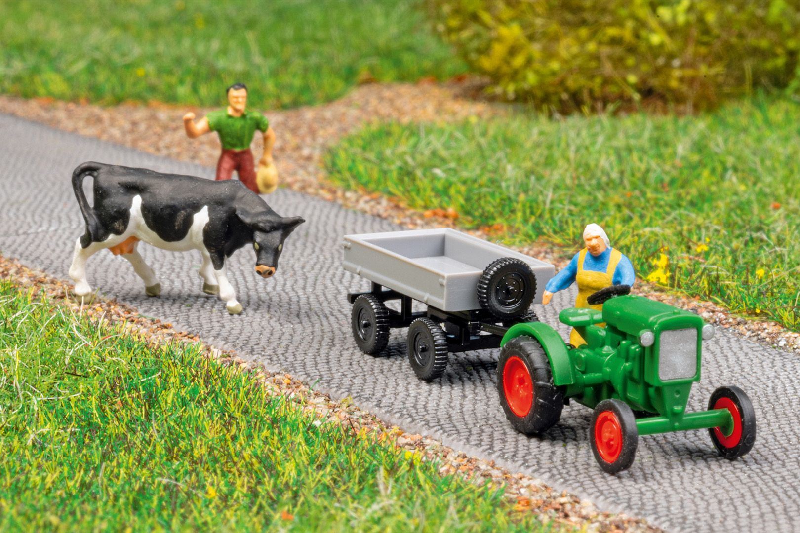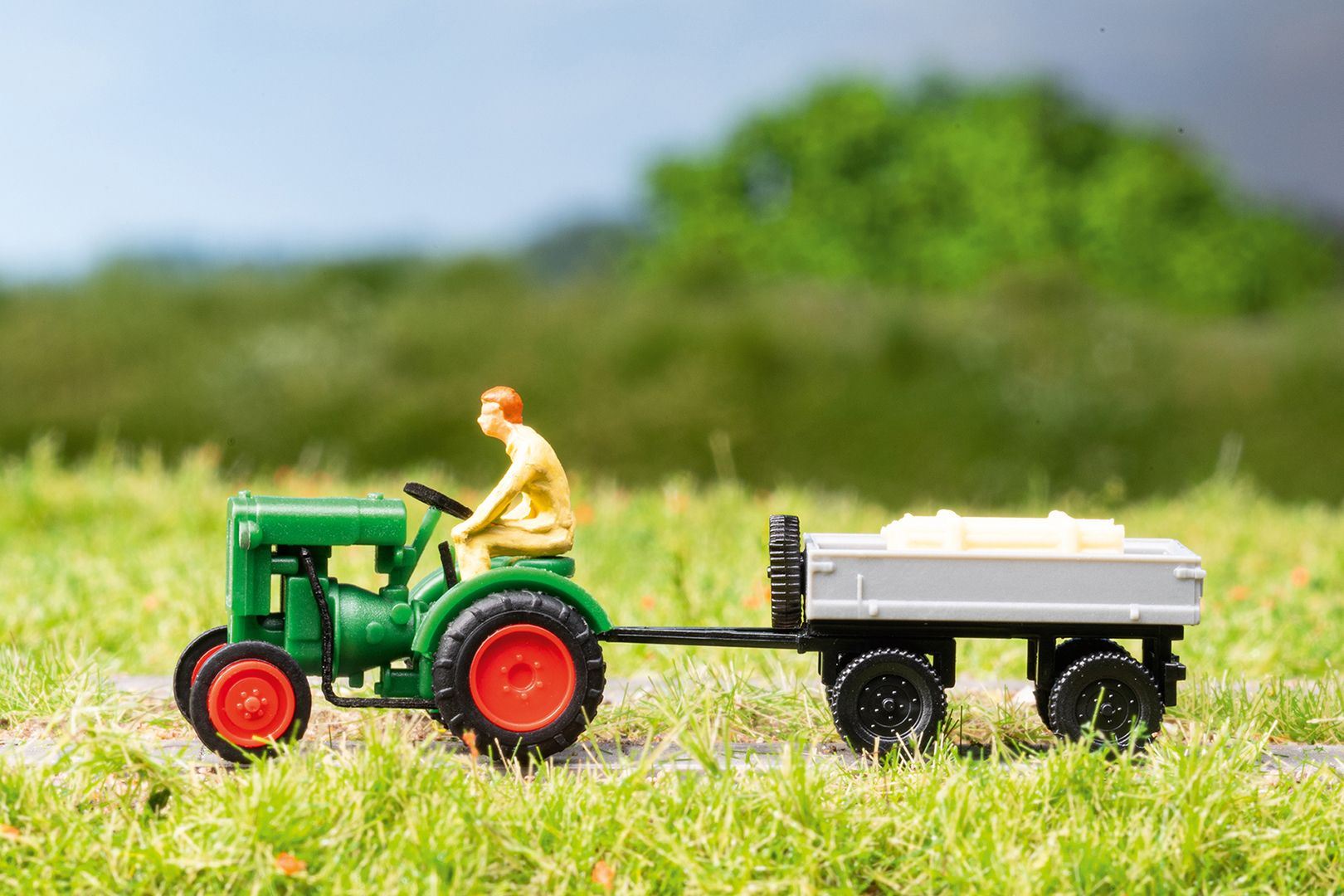 Bausatz. Der ab 1936 gebaute Deutz F1M414 Traktor, ermöglichte durch seinen niedrigen Anschaffungspreis die Mechanisierung auch kleinerer Landwirtschaftsbetriebe. Mit einer verkauften Stückzahl von 20.000 <br>Exemplaren war er oft anzutreffen. Das filigrane, mit originalgetreuer Bereifung ausgestattete Modell orientiert sich an der ursprünglichen 3-Gang Vorkriegsversion um auf jeder Modellbahnanlage eingesetzt werden <br>zu können. Ergänzt wird das Gespann mit einem Anhänger für Multicar/Kleintraktoren.<br><br>Schlepper 14 x 10 x 9 mm<br>Anhänger 21 x 8 x 7 mm Hersteller: Auhagen