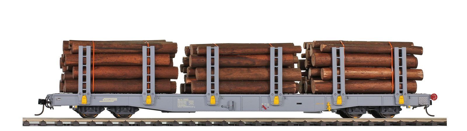 0m RhB Sp-w 8360 Rungenwagen beladen LüP: 366,5mm Mindestradius 1200 mm steckbare oder unter dem Rahmen verstaubare Bühnengeländer Ladefläche mit Holzdetaillierung angesetzte Bremsgestänge, Kessel und Bremsleitungen Drehgestell mit Bremsbacken in Radsatzebene werkseitig bestückt mit Kadee-Kupplungen als Austauschteile liegen federnde Mittelpuffer bei, vorbereitet zur Aufnahme von Schraubenkupplungen Austauschradsätze und – kupplungen für Fama/Utz sind optional als Zubehör erhältlich Metallräder mit aufgedruckten Radsatzmarkierungen Hersteller: Bemo