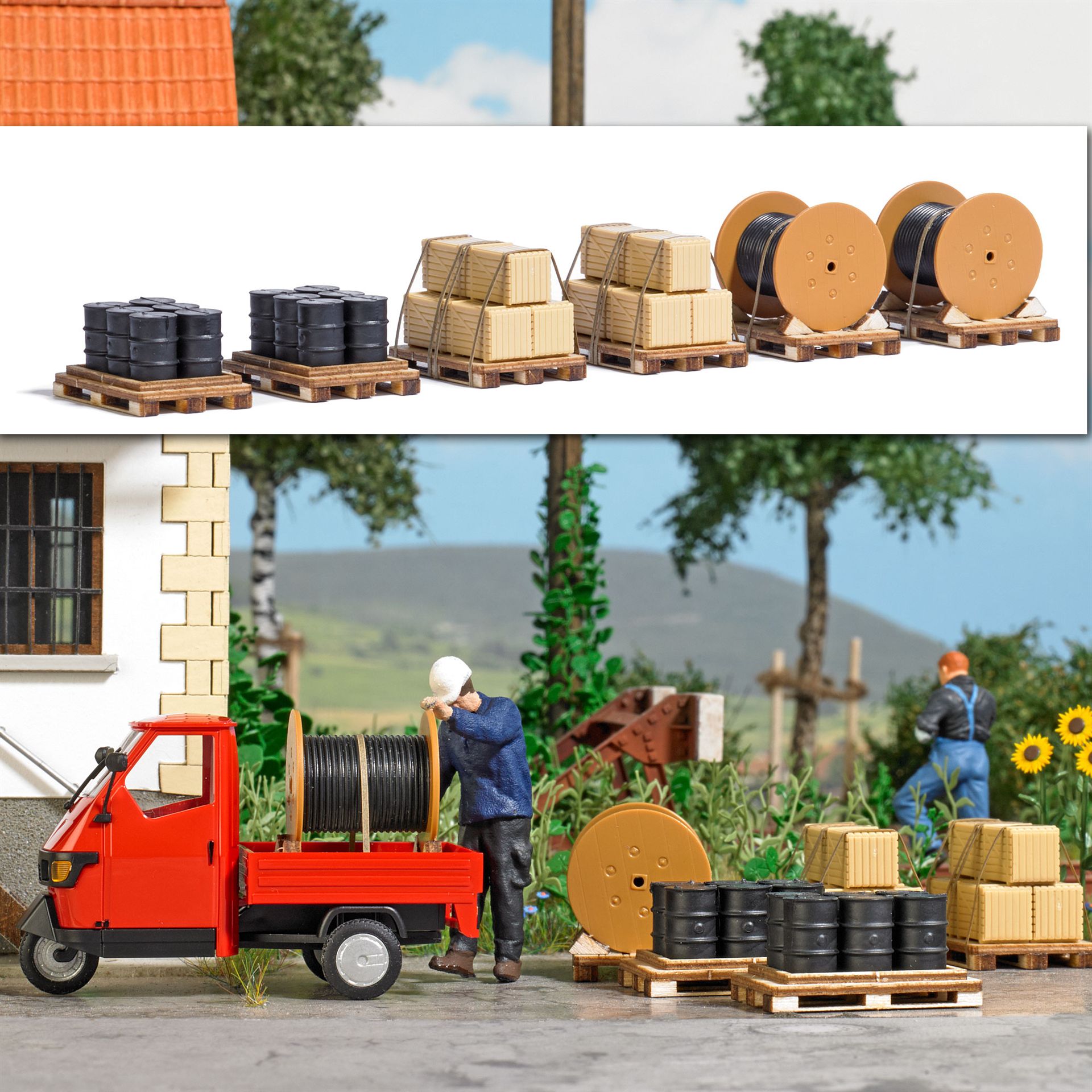 Bausatz für 6 Paletten aus echtem Holz mit unterschiedlichen Beladungen: 2 Kabeltrommeln, 6 Ölfässer und 12 Kisten. Größe der Paletten jeweils: 27 x 18 mm, Höhe: 2 mm.