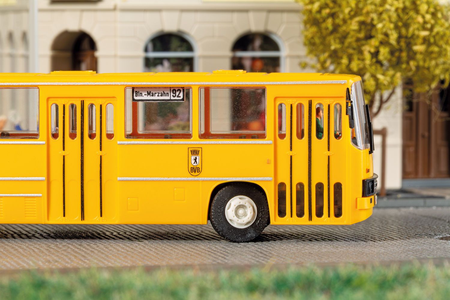 Bausatz. Fein detaillierte und akkurat bedruckte Modellnachbildung des dreitürigen Stadtomnibus „260“ des ungarischen Herstellers Ikarus. Bündig einzusetzende Scheiben sowie einzeln zu montierende transparente<br>Leuchten, vorbildgerechte Bereifung und Rollfähigkeit zeichnen das Fahrzeug aus. Einlenkbar darstellbare Vorderräder sowie eine zum Selbstbemalen beiliegende Fahrerfigur unterstützen die Gestaltung realistischer Szenen. 92 × 21 × 25 mm Hersteller: Auhagen