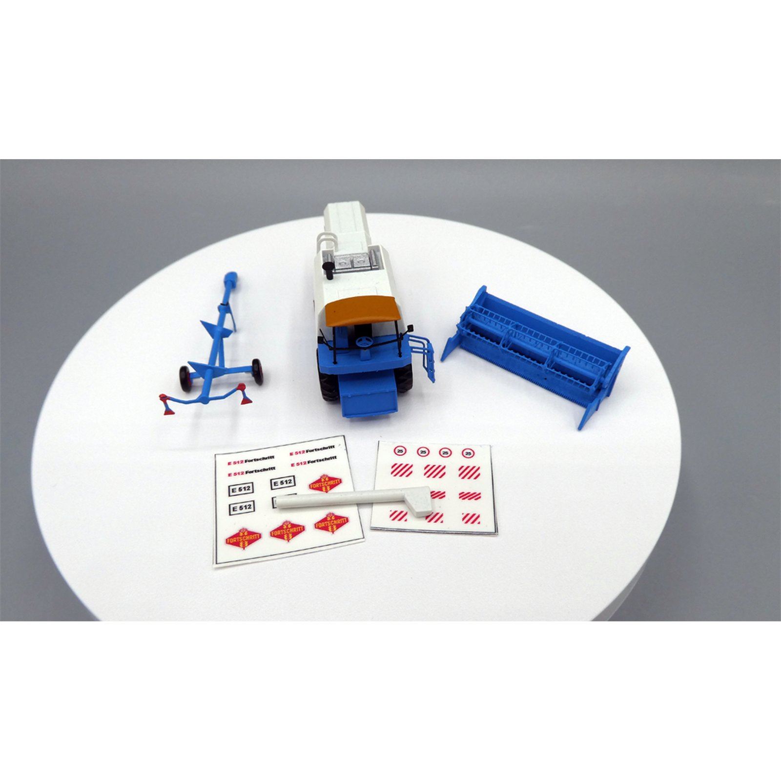 Mähdrescher E 512 Fortschritt mit Hänger für Schneidwerk, offene Kabine, blau Neukonstruktion, additive Fertigung, Fortschritt- Decals zur Beschriftung liegen bei Hersteller: TT-Koch