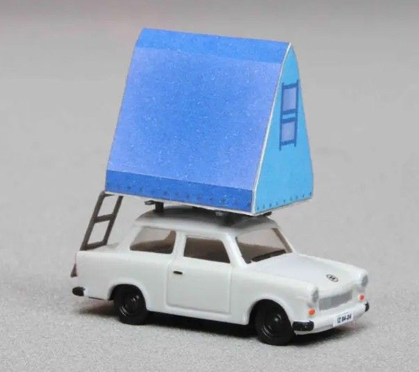 TT Trabant 601 Limousine hellblau + Dachzelt „Villa Sachsenruh“ grün / gelb