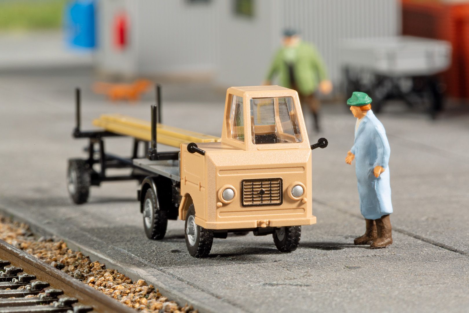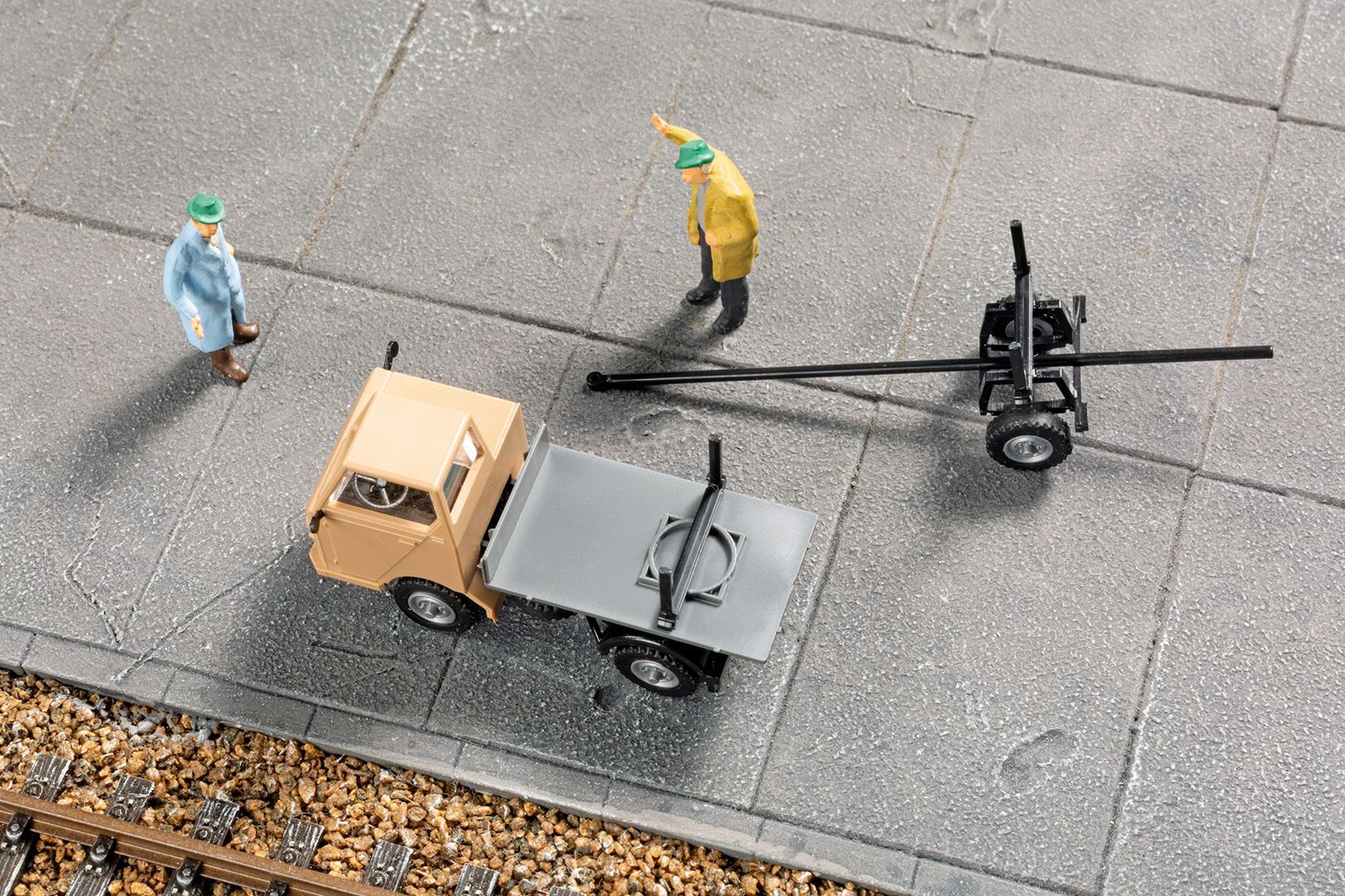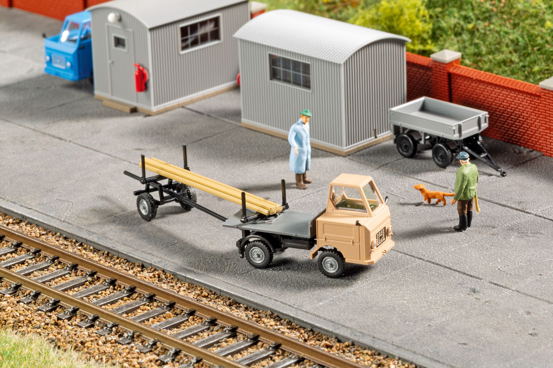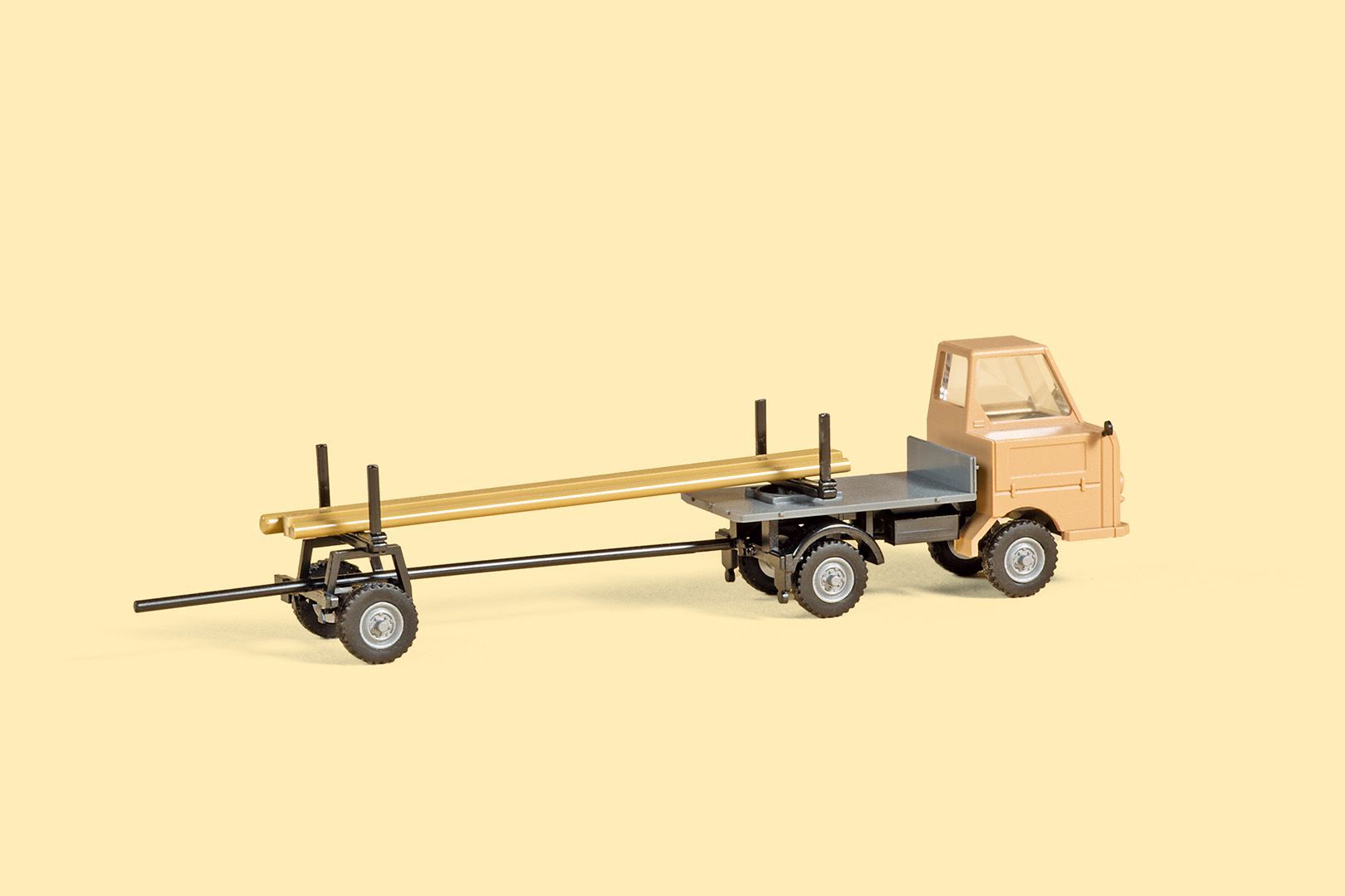 Bausatz. Zum sicheren Transport für lange Güter (z.B. beiliegende Holzmasten), bietet sich ein gezogener Nachläufer ideal an. Die Ladung liegt dabei sowohl auf dem Drehschemel des Multicar M22-Modells als auch zwischen den Rungen des Nachlaufanhängers, der über eine verstellbare Zugstange verbunden ist.