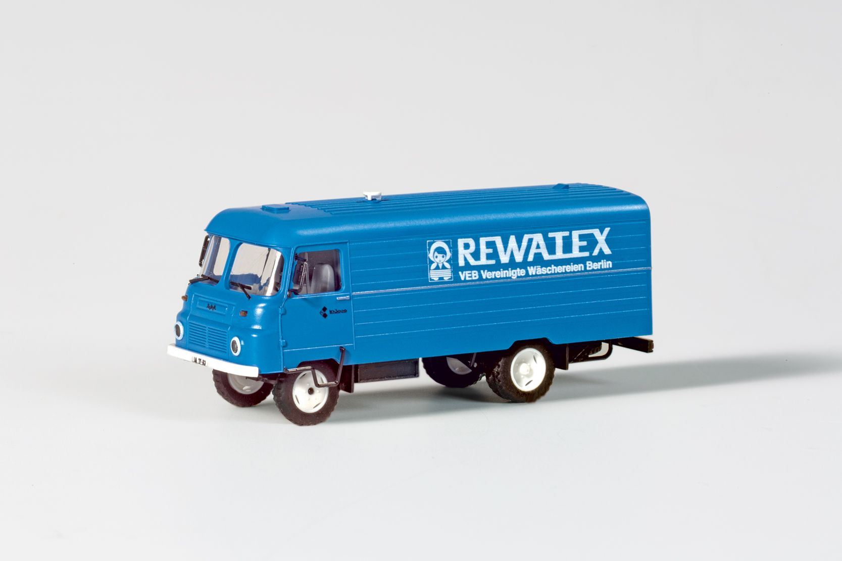 MC Robur LD3000 Kastenwagen REWATEX Bausatz. Der seit 1978 in überarbeiteter Form produzierte ROBUR Kastenwagen unterscheidet sich durch die nun gesickten Seitenwände und dem heckseitigen Unterfahrschutz von seinem Vorgänger. Anfänglich nur mit Ottomotor lieferbar, war ab 1982 auch wieder ein Dieselmotor im ROBUR Fertigungsprogramm und wurde dann überwiegend in den Fahrzeugen verbaut. Die in den Zittauer VEB Robur Werken gefertigten Fahrgestelle wurden per Bahn zur Endmontage nach Halle gesendet. Der dortige VEB Karosseriewerk Halle fertigte den Kastenaufbau und übernahm die finale Endmontage dieser u.a. als Lieferfahrzeug im Einzelhandel, in der Lebensmittelindustrie und auch im Dienstleistungsgewerbe - um nur ein paar Beispiele aufzuzählen - eingesetzten Variante des ROBUR Frontlenker LKW. 53,5 x 21,5 x 24 mm Hersteller: Auhagen