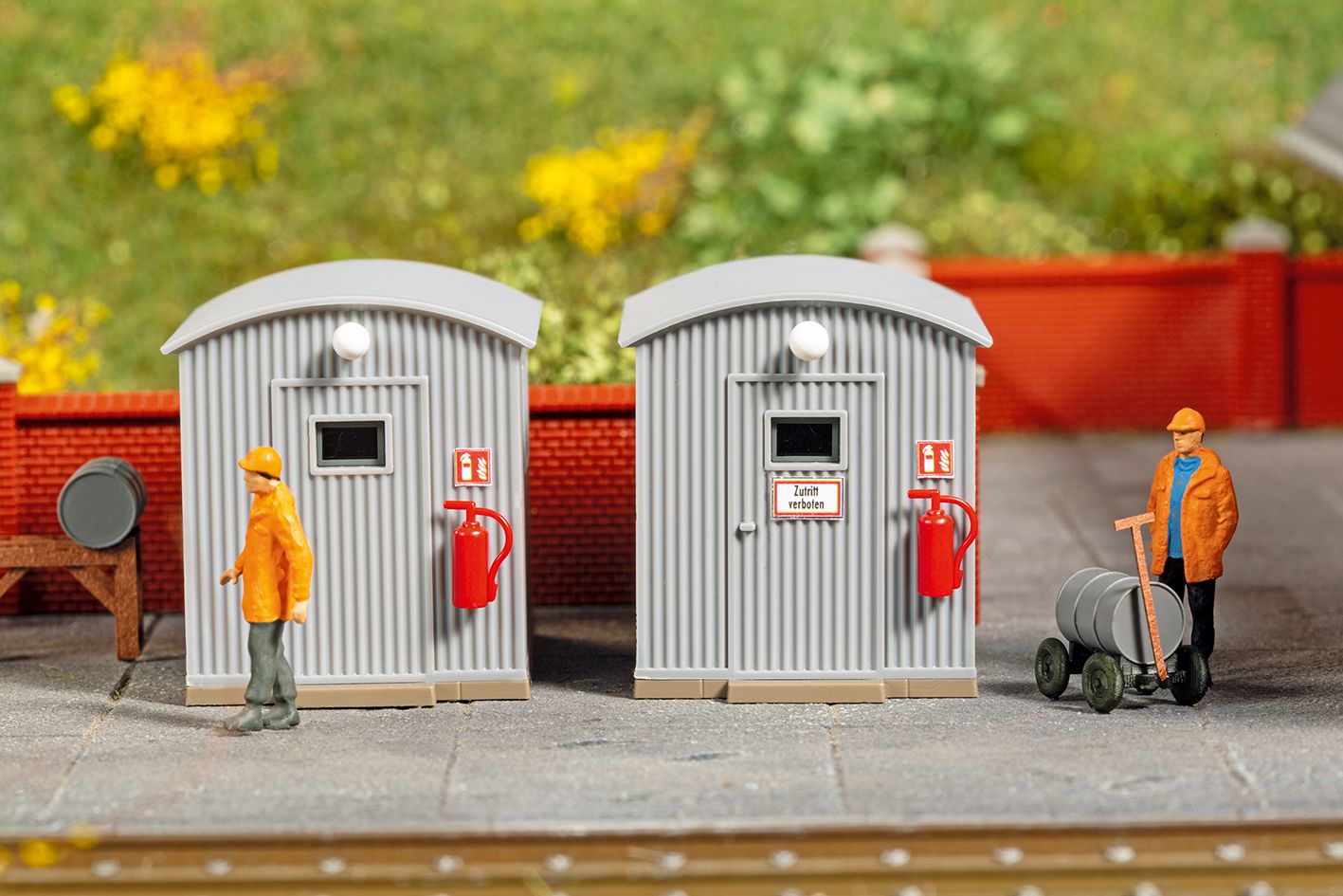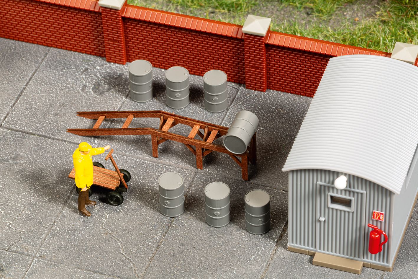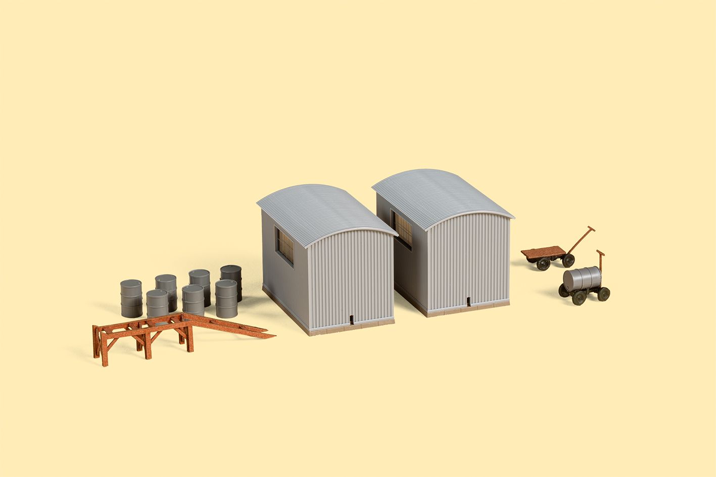 Zwei typische Wellblechhütten, wie sie vielerorts als Öllager zum Einsatz kamen. Die Hütten lassen sich vielseitig einsetzen - einzeln oder als Ensemble. Eine Rampe aus stabilem Karton in Lasercut-Technologie liegt bei und erleichtert das Be- und Entladen. Zum Zubehör gehören mehrere Fässer sowie zwei Varianten eines Fasswagens - einmal mit aufgeladenem Fass, einmal als Flachwagen. Ein ideales Modell zur Ausgestaltung von Industrieanlagen, Betriebsbahnhöfen oder Werkhöfen. Wellblechhütte je 31 x 21 x 23 mm Fassrampe 37 x 6 x 7 mm