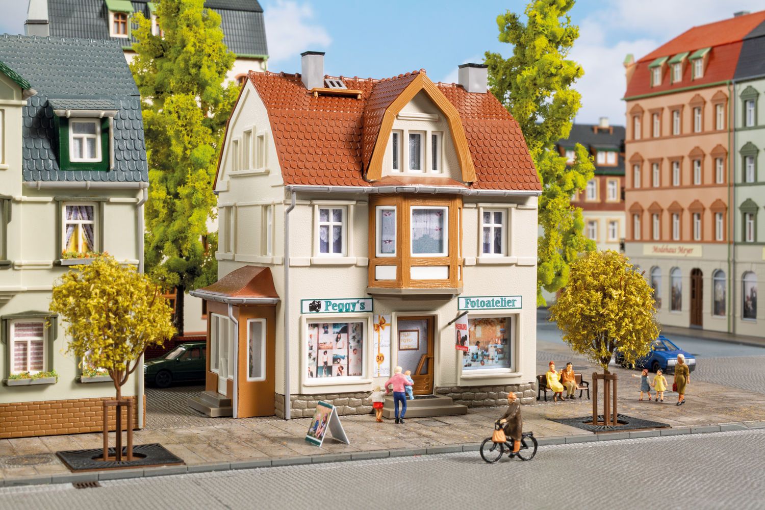 Ein typisches Wohnhaus mit Läden im Erdgeschoss, das sofort nach Innenstadt aussieht. Für die Ausgestaltung liegen Dekorationen bei, wahlweise für ein Uhren- und Schmuckgeschäft oder für das Fotoatelier. So lässt sich das Modell gut an den eigenen Straßenzug anpassen. 92 × 88 × 99 mm Hersteller: Auhagen