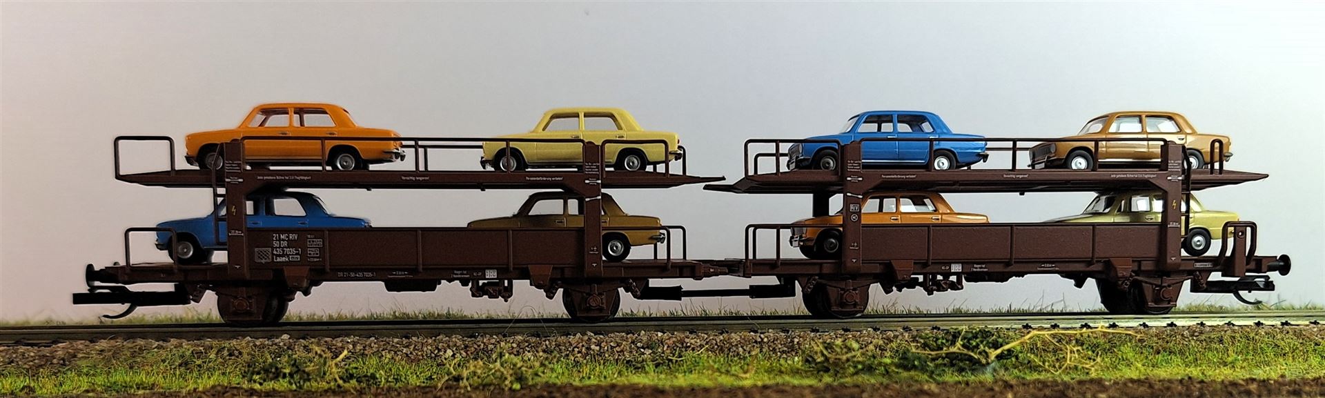 TT Autotransportwagen-Einheit Laaek 4357 der DR, beladen mit 8 PKW Lada 1200
