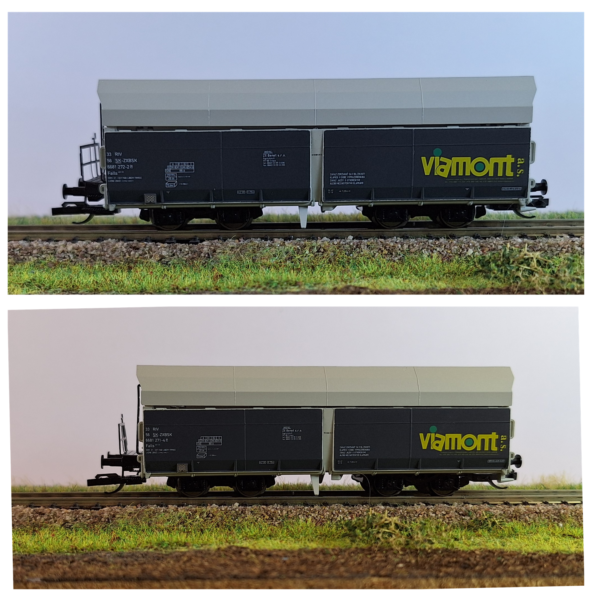 TT Güterwagenset der Viamont a.s., bestehend aus zwei Selbstentladewagen Falls, Ep. VI LüP: 218mm Kupplungsaufnahme und Kurzkupplungskinematik