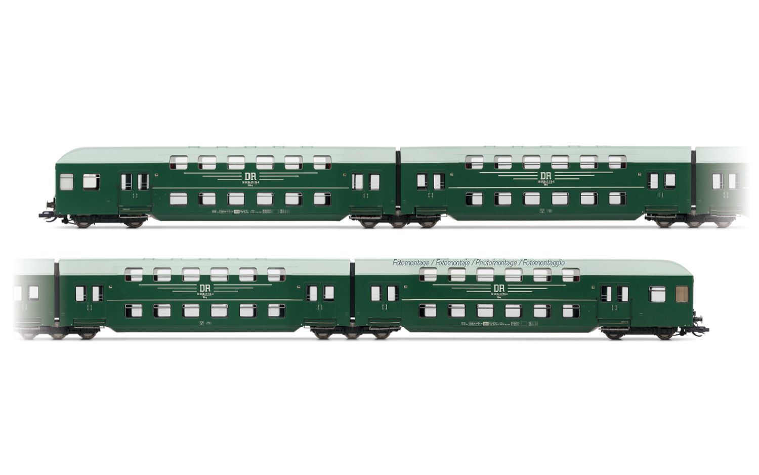 DR, 4-tlg. Doppelstockeinheit ohne Steuerabteil, in grüner Farbgebung mit grauem Dach, Ep. IV 6-polige Schnittstelle Hersteller: Arnold TT