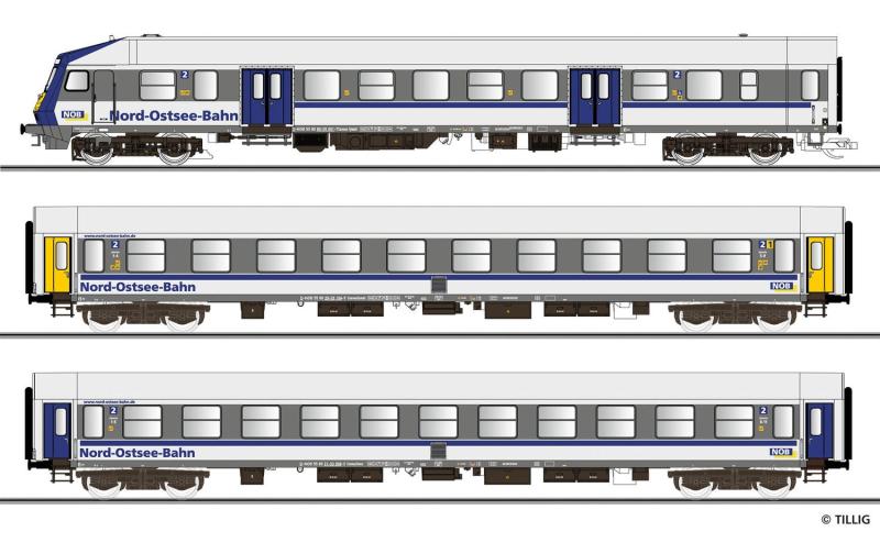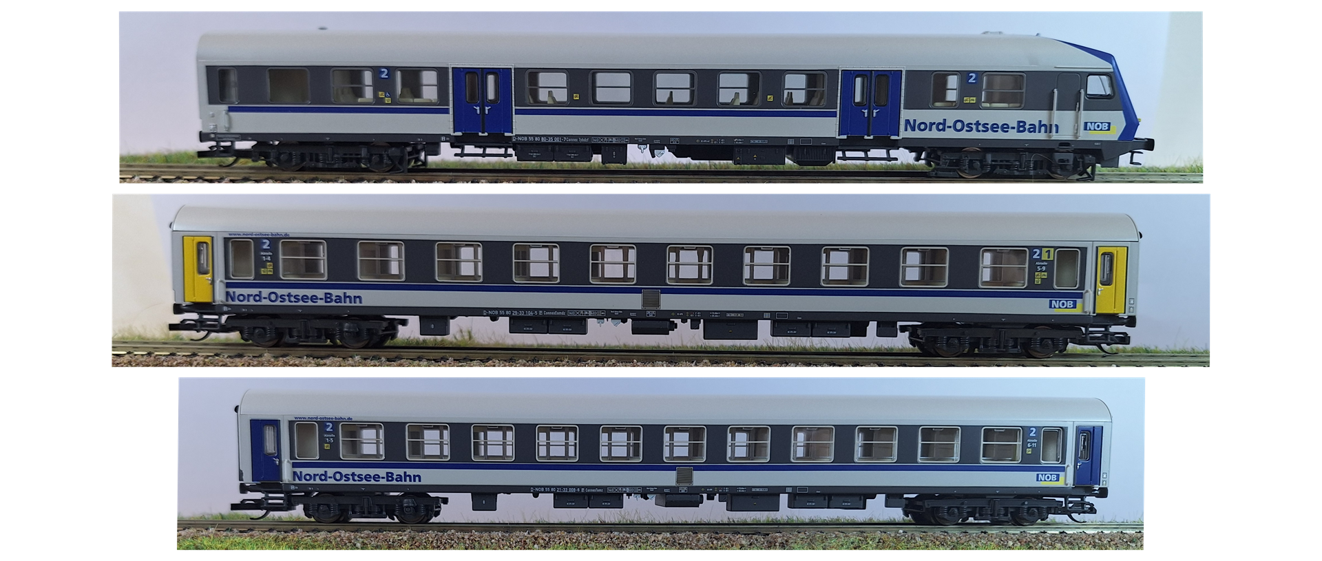 TT Reisezugwagenset „Nord-Ostsee-Bahn“, Transdev GmbH Ep.VI bestehend aus einem Steuerwagen, einem Reisezugwagen 1./2. Klasse und einem Reisezugwagen 2. Klasse, Bauart Halberstadt