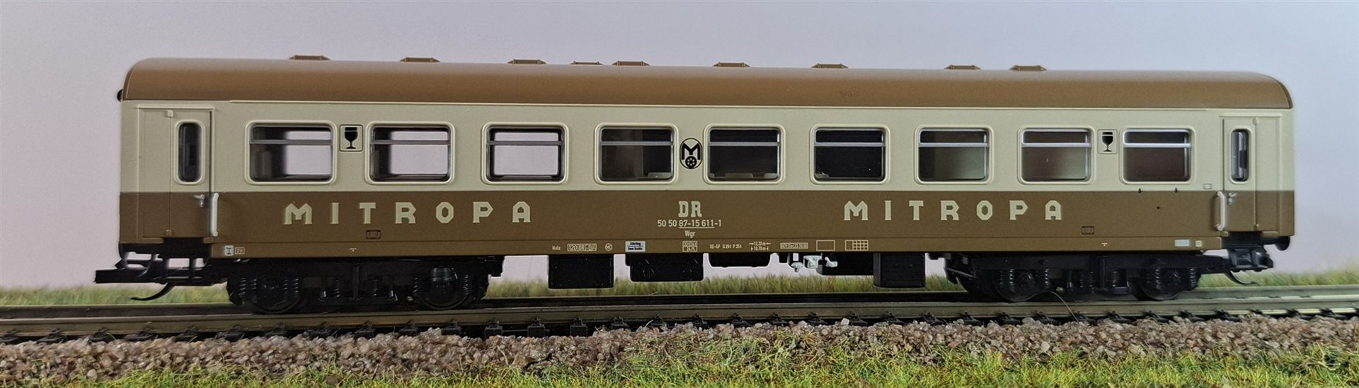 TT Buffetwagen Wgr der DR, Ep.IV LüP: 155mm mit Innenbeleuchtung nachrüstbar mit Inneneinrichtung ausgestattet Kupplungsaufnahme und Kurzkupplungskinematik