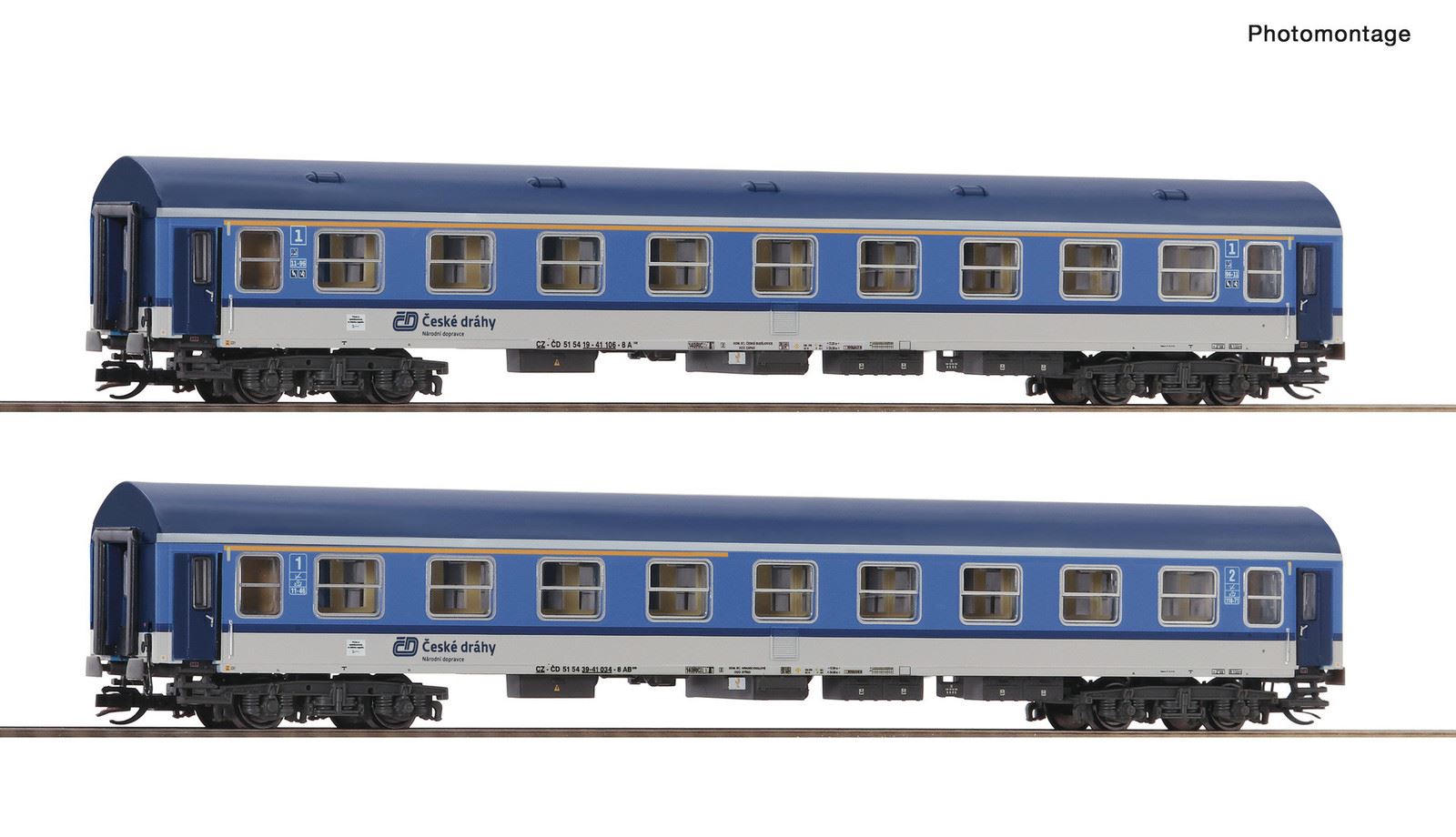 Wagenset 1 mit zwei Reisezugwagen Bauart Y/B 70 der Tschechischen Staatsbahnen.Bestehend aus einem Reisezugwagen 1. Klasse, Gattung A und einem Reisezugwagen 1./2. Klasse, Gattung AB. Fein detaillierte Modelle mit extra angesetzten Steckteilen Mit vorbildgerechter Inneneinrichtung Schacht NEM 358 mit KK-Kinematik Mit Inneneinrichtung ausgestattet Innenbeleuchtung Nachrüstbar Länge über Puffer 408 mm
