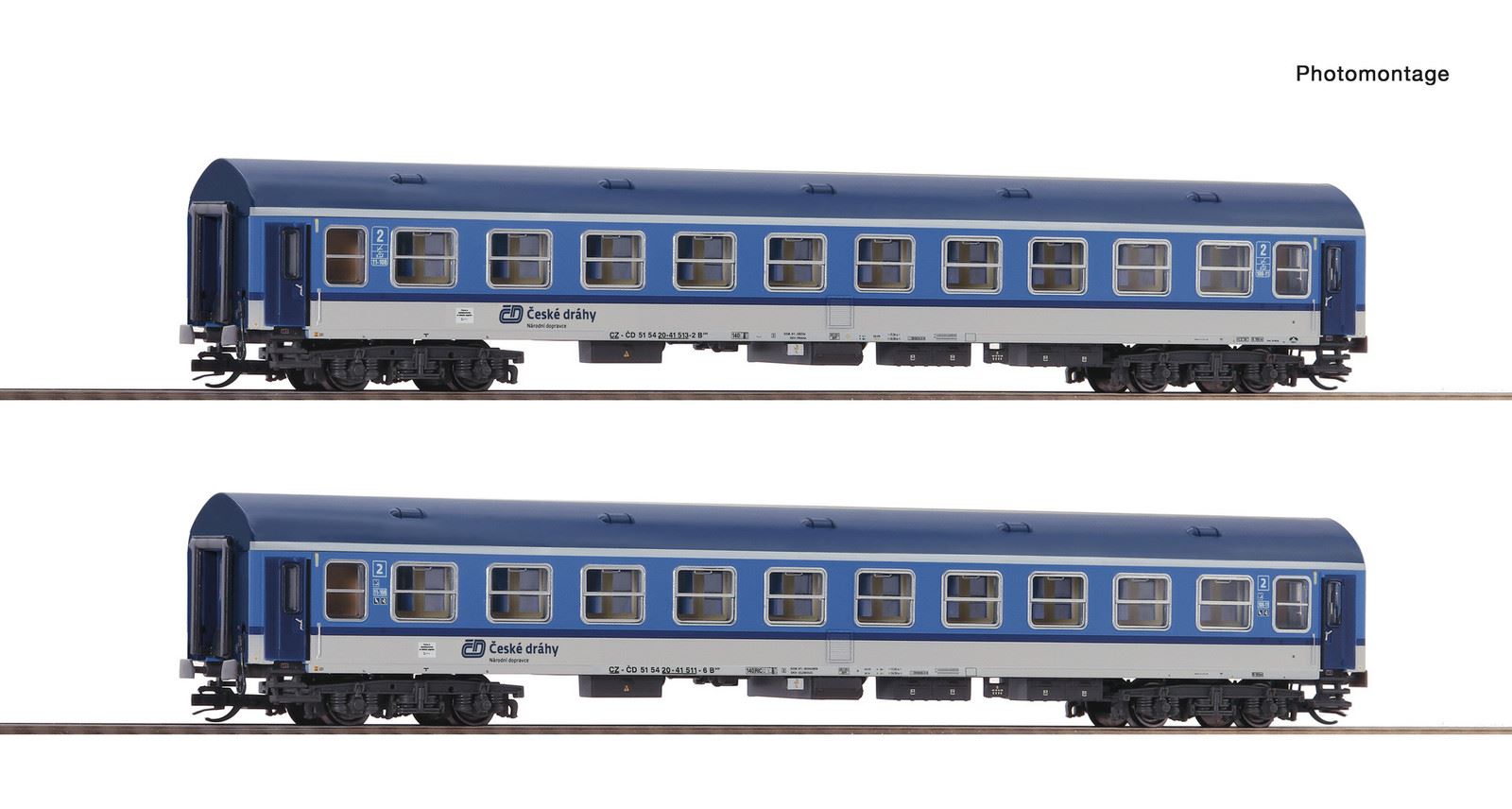Wagenset 2 mit zwei Reisezugwagen 2. Klasse Bauart Y/B 70, Gattung B, der Tschechischen Staatsbahnen. Mit unterschiedlichen Betriebsnummern Fein detaillierte Modelle mit extra angesetzten Steckteilen Mit vorbildgerechter Inneneinrichtung Schacht NEM 358 mit KK-Kinematik Mit Inneneinrichtung ausgestattet Innenbeleuchtung Nachrüstbar Länge über Puffer 408 mm