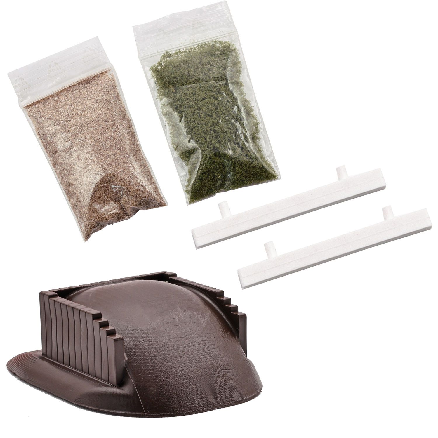 Bausatz für 2 Prellböcke in ländlicher Ausführung. <br>Mit 2 Kastenprellböcken, 2 Querhölzern, Sand- und Flockmaterial. Geeignet für TT-Gleise ohne Bettung.