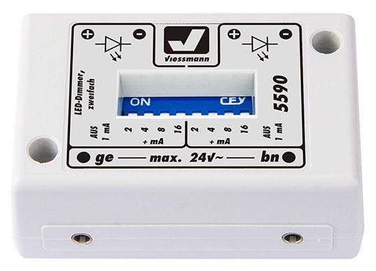 Das Modul ermöglicht den Betrieb von einzelnen LEDs und LED-Leuchtstreifen mit stabiler und einstellbarer Helligkeit. Dazu versorgt das Modul die Verbraucher mit einem in Stufen einstellbaren Strom, der von der Versorgungsspannung des Moduls und von den Eigenschaften der LEDs weitestgehend unabhängig ist. LED-Leuchtstreifen dürfen bis zu 7 LEDs in Reihe geschaltet haben. Geeignet für Viessmann LED-Leuchtstreifen z. B. Art. 5086 – 5089. Das Modul hat zwei Ausgänge. Unabhängig voneinander kann für jeden Ausgang mit jeweils 4 DIP-Schaltern (binär) die Helligkeit der LEDs über die Stromstärke eingestellt werden. Beginnend von ca. 1 mA lassen sich Ströme bis maximal ca. 31 mA einstellen. Die maximale Eingangsspannung beträgt 24 V AC.