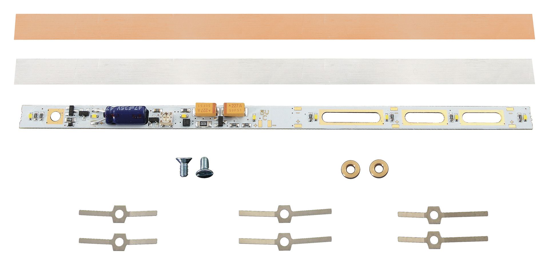 LED-Innenbeleuchtungssatz als Ersatz für die Art. 9445, 9457 und 9458. Dank Pufferkondensatoren flackerfreie Beleuchtung auch bei kurzen Stromunterbrechungen. Einsetzbar im analogen wie digitalen Betrieb unter Gleichstrom. Abmessung (LxBxH) 146 x 7 x 5 mm Hersteller: Fleischmann