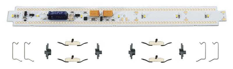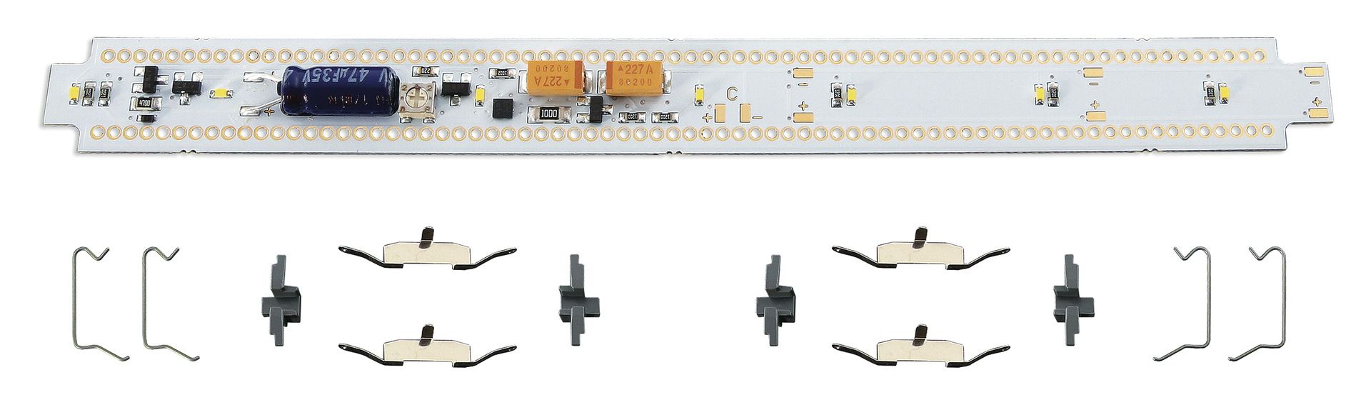 LED-Innenbeleuchtungssatz als Ersatz für den Art. 9467. Dank Pufferkondensatoren flackerfreie Beleuchtung auch bei kurzen Stromunterbrechungen. Einsetzbar im analogen wie digitalen Betrieb unter Gleichstrom. Abmessung (LxBxH) 136 x 13 x 5 mm Hersteller: Fleischmann