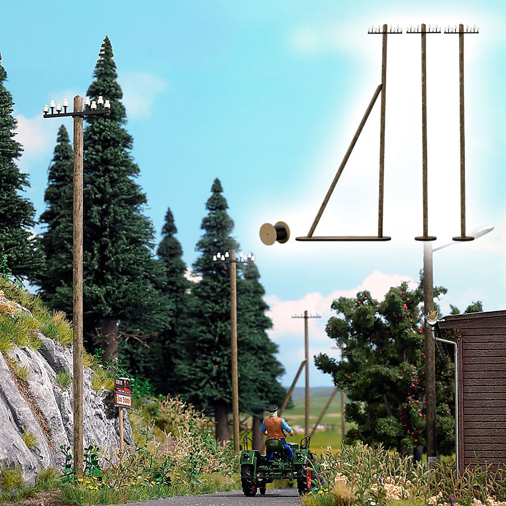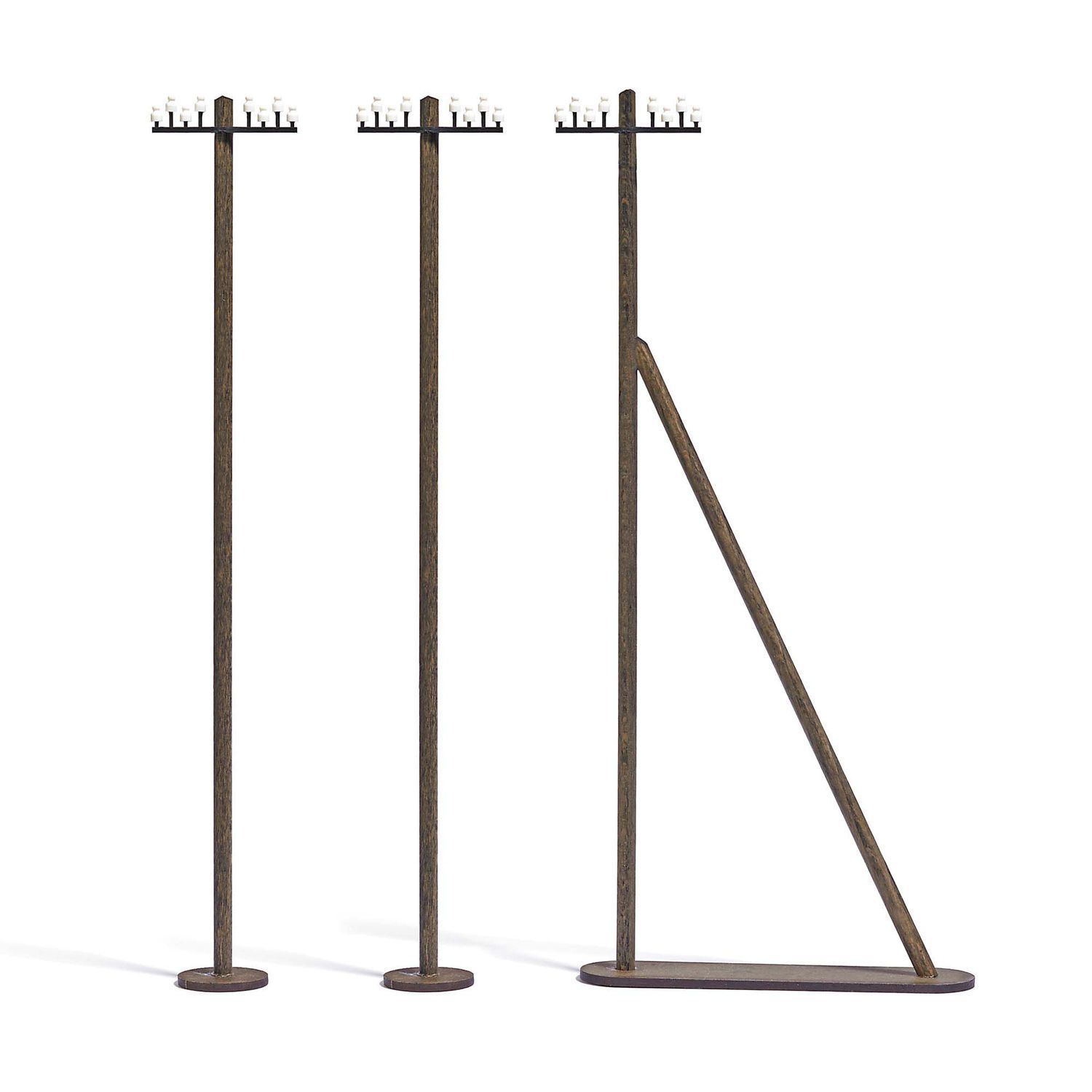 Authentische Nachbildung von 3 Telegrafenmasten aus Echtholz. Mit filigranen Isolatoren in Porzellanoptik. Zwei Masten gerade, ein Mast mit Seitenausleger. <br><br>Höhe der Masten 185 mm.