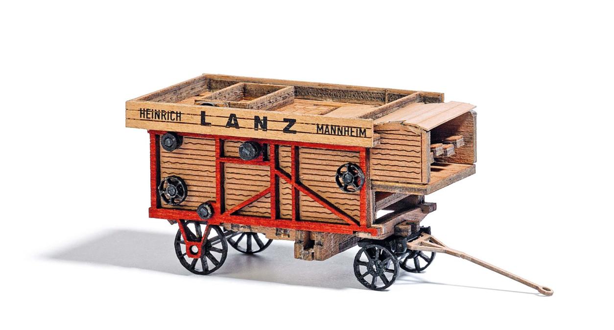 Schon früh versuchte man, das mühsame Dreschen des Getreides nicht mehr in schwerer Handarbeit zu bewältigen - mechanische Helfer mussten her! Die Geschichte der Dreschmaschinen beginnt bereits 1786 mit einem Schlagleistendrescher des schottischen Maschinenbauingenieurs Andrew Meikle. Seit dieser Zeit wurden die Maschinen immer weiter ausgeklügelt und verbessert. Die anfangs über Pferdegöpel oder Dampfmaschinen - gelegentlich auch mit der Hand - betriebenen Drescher wurden schlussendlich mittels Elektro-, stationärer Verbrennungsmotoren oder Traktoren angetrieben. Die Dreschmaschinen, auch »Dreschkasten« genannt, waren in den Anfängen zunächst aus Holz gefertigt, bevor 1929 der revolutionäre »Stahl-Lanz« in Ganzstahlbauweise vorgestellt wurde. Nach und nach wurde auch diese technische Errungenschaft ausgebaut und verbessert, bis in den 50er und 60er Jahren die altbewährte Dreschmaschine vom vollautomatischen Mähdrescher abgelöst und vom Markt verdrängt wurde. <br><br>Neben verschiedenen Bildern und historischen Plänen stand auch ein Original dem Modell Pate. In einer alten Scheune im vogtländischen Freilichtmuseum Landwüst (Ortsteil von Markneukirchen) konnte eine Lanz Dreschmaschine ausfindig gemacht werden. Dies ermöglichte es, offene Fragepunkte zu klären. Auch wenn das gute alte Stück schon »in die Jahre gekommen« ist, befindet es sich dennoch in verhältnismäßig gutem Zustand, so dass insbesondere Farbgebung und Struktur gut abgenommen werden konnten. (Die Abbildung zeigt den Dreschwagen mit heruntergeklappter Dachgalerie, damit er so leichter in die niedrige Scheune einfahren kann.) <br><br>Die Miniatur ist dem Vorbild aus dem Jahr um 1911 nachempfunden, eine Zeit, in der man noch lange nicht an einen vollautomatischen Mähdrescher dachte. Das Modell ist die perfekte Ergänzung für historische Anlagen - oder als Scheunenfund oder »Hingucker« für Anlagen nach modernerem Vorbild.