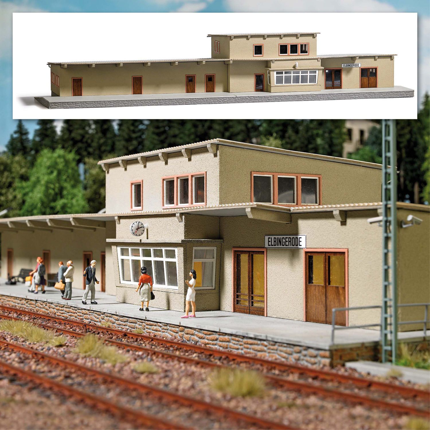 Bausatz für den Bahnhof nach Originalvorbild in Elbingerode im Harz (Sachsen/Anhalt). Das an der sogenannten »Rübelandbahn« (ehemals »Harzbahn«) gelegene Bahnhofsgebäude ist im funktionalen Baustil der 1960er Jahre gehalten. Vorbildgerechte Gestaltung der Details wie dem Treppenaufgang mit typischem Windfang auf der Straßenseite sowie des nach drei Seiten verglasten Fahrdienstleiterraumes auf der Bahnsteigseite. Türen und Fenster sind aus echtem Holz gefertigt. Bahnsteig mit nachgebildetem Natursteinsockel. Beleuchtbar mit Busch LEDs 5998.<br> <br>Größe Gebäude: 340 x 114 mm, Höhe: 56 mm. <br>Größe Bahnsteigsockel: 362 x 104 mm, Höhe: 7 mm. <br><br><br>Durch einen stabilen, zusammensteckbaren Unterbau, der mit den fertig geschnittenen und kolorierten Teilen verkleidet wird, ist der Zusammenbau besonders einfach. Zusätzlich sind lediglich ein Bastelmesser und Modellbaukleber (z.B. Busch 7599) oder Alleskleber (z.B. UHU® Kraft) erforderlich.