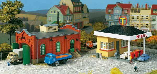 Ein kleiner Reparaturbetrieb ca. 1890 erbaut. In den 1930er Jahren wurden die alten Tanksäulen ersetzt und ein Gebäude errichtet. Torflügel beweglich.<br>Originalmodell<br>80 x 90 x 90 mm<br>130 x 85 x 75 mm Hersteller: Auhagen