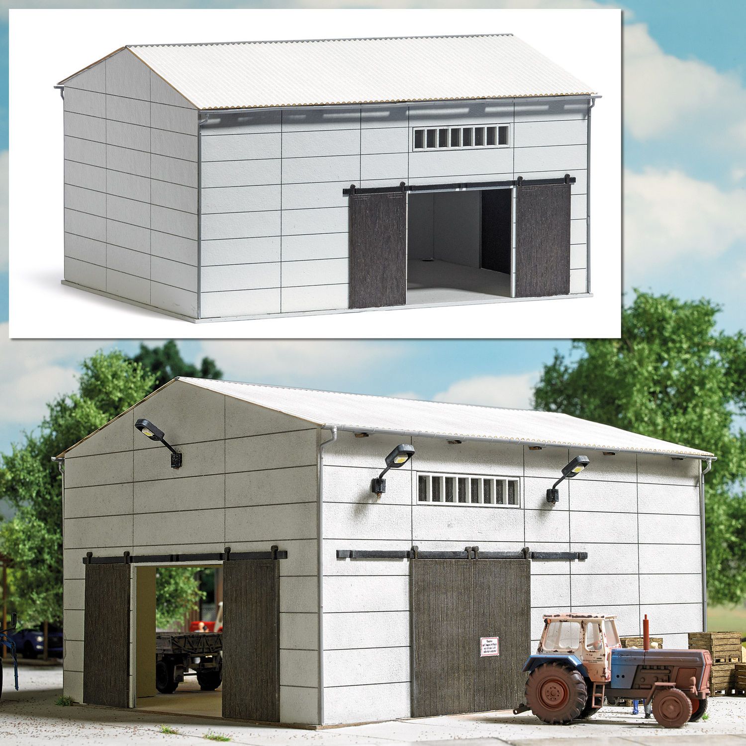 Modell einer LPG-Bergehalle zur witterungsgeschützten Lagerung von Heu, Stroh, Futter und Maschinen. Die Betonbauweise der LPG-Gebäude ist in diesem Bausatz durch farblich behandelten Spezialkarton authentisch dargestellt. Große Schiebetore (Öffnung: 34 x 32 mm) aus echtem Holz an drei Seiten des Gebäudes, in geschlossenem oder geöffnetem Zustand montierbar. Beleuchtbar mit Busch LEDs 5998.