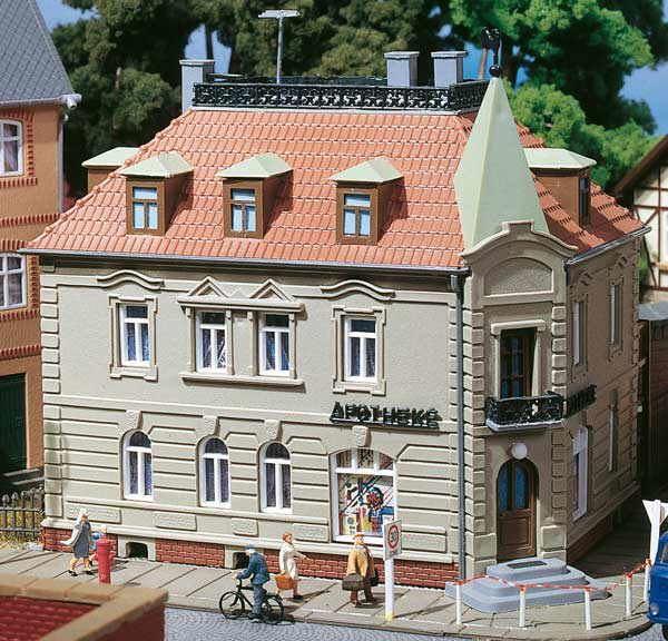 Die Bauzeichnung der Oschatzer Apotheke signierte der Architekt unter dem Datum Juni 1896. Detaillierte, gut strukturierte Fassade, interessante Dachgestaltung, Balkonanbau in Holzbauweise an der Rückfront. So ist das Modell geeignet, das Stadthäuser-Sortiment sinnvoll zu ergänzen. Auch als Eckhaus einsetzbar.