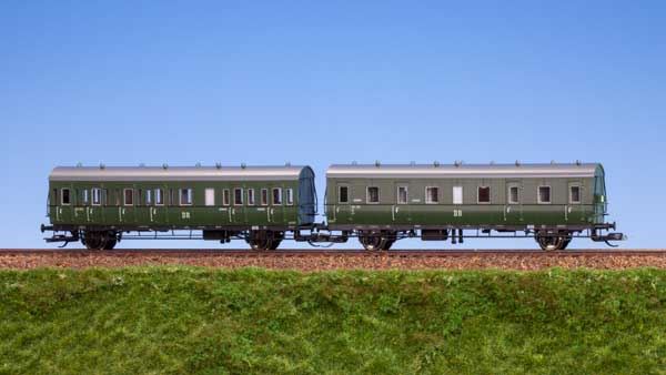 2-er Set Einheits-Abteilwagen bestehend aus den Bauarten D21b und BC21 DR Epoche III, komplett zugerüstet, für Beleuchtung vorbereitet Hersteller: Modelleisenbahn Schirmer