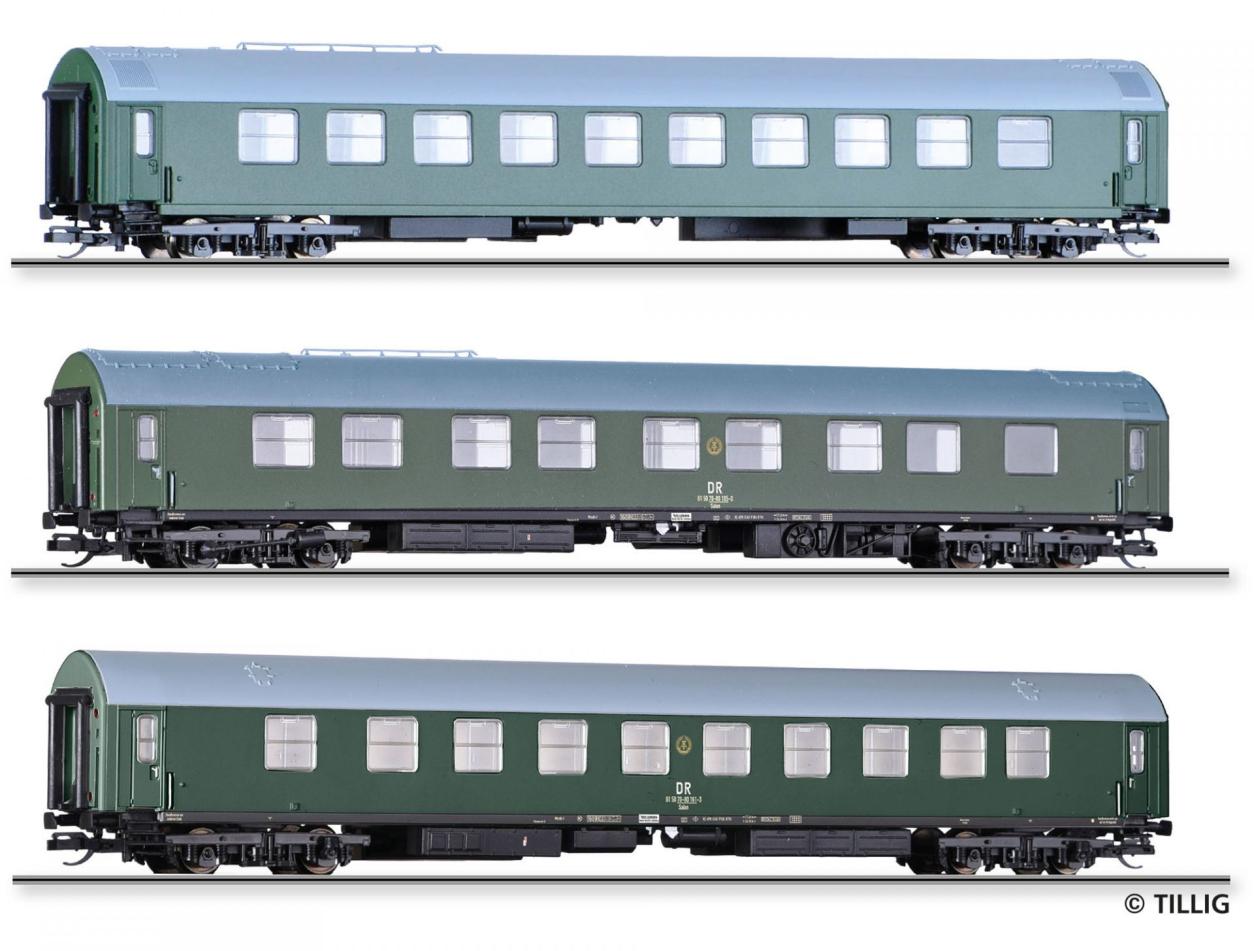 TT Reisezugwagenset „Salonwagenzug 4“ der DR, bestehend aus Salonspeisewagen mit Küche, Salonschlafwagen mit Tagesraum und Nachrichtenwagen, Ep. IV