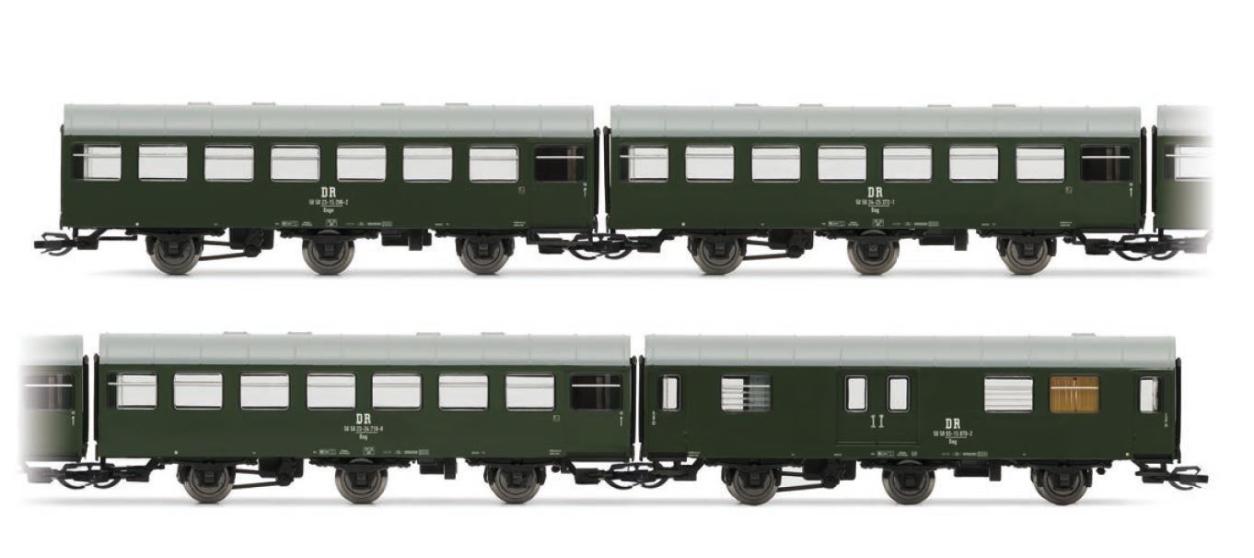 DR, 4-tlg. Wagenset "Rekowagen", bestehend aus einem Packwagen und 3 dreiachs. Rekowagen in dunkelgrüner Lackierung, Ep. IV vorbildegerechte Umsetzung vorbildegerechte DAchform mit Schweißnäht...