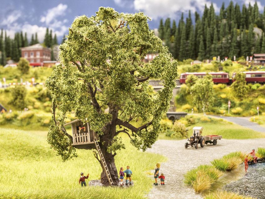 Baum mit Baumhaus Die mächtige Eiche mit dem liebevoll gestalteten Baumhaus ist ein ganz besonderer Hingucker auf jeder Modell-Landschaft. Das Baumhaus ist ein Laser-Cut Gebäude als Fertigmodell...