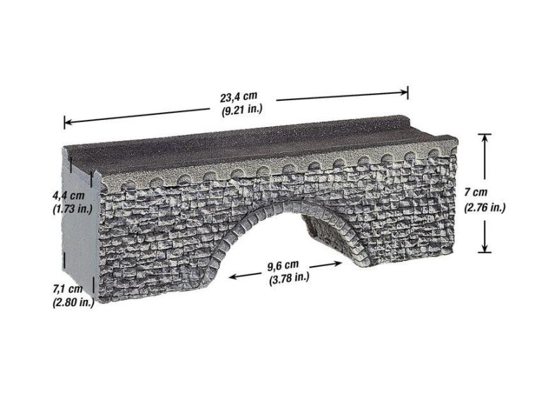 Typische Steinbrücke in Bogenform und mit einem Brückenpfeiler. Die Brücke ist auch ohne Brückenpfeiler einsetzbar. Die Fahrbahn kann in verschiedenen Breiten aufgebaut werden, daher universell einsetzbar, z.B. als Fußgängerbrücke oder für verschiedene Maßstäbe. <br><br>Größe der beiden enthaltenen Brückenelemente mit Pfeiler insgesamt: 239 x 47 mm, Höhe: 110 mm. <br><br>Größe einzelnes Brückenelement: 119 x 47 mm, Höhe: 30 mm. <br><br>Größe Pfeiler: 47 x 15 mm, Höhe: 75 mm. <br><br>Mögliche Breiten der Brücke: 47 mm (H0), 30 mm (TT) und 25 mm (N).