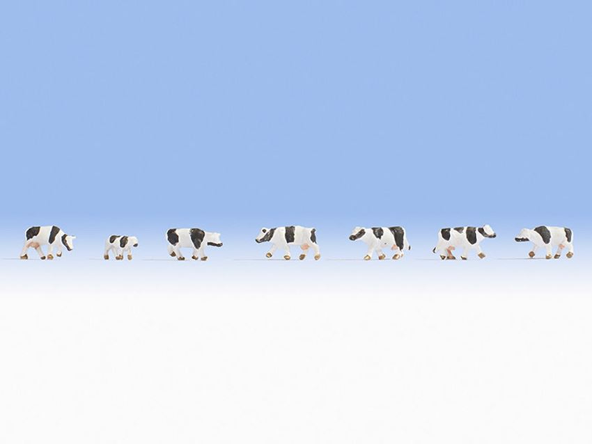 Das Modellfiguren-Set Kühe schwarz-weiß enthält sieben Kühe. Alle Modelltiere sind handbemalt und können ganz beliebig auf der Modellbahnanlage und dem Diorama eingesetzt werden. Wer eine landwirtschaftliche Szene gestalten möchte, greift am besten zu den Kühen von NOCH. Sie sind schwarz-weiß und sogar ein kleines Kalb ist im Set enthalten. Damit kann der Bauernhof realistisch und naturgetreu ausgestaltet werden. Wer ein wenig Abwechslung möchte, kann auch die braun-weißen Kühe (Art.-Nr. 44251) oder die braunen Kühen (Art.-Nr. 44252) verwenden. Wie überall beim Hobby Modell-Landschaftsbau kann auch hier der Kreativität freien Lauf gelassen werden