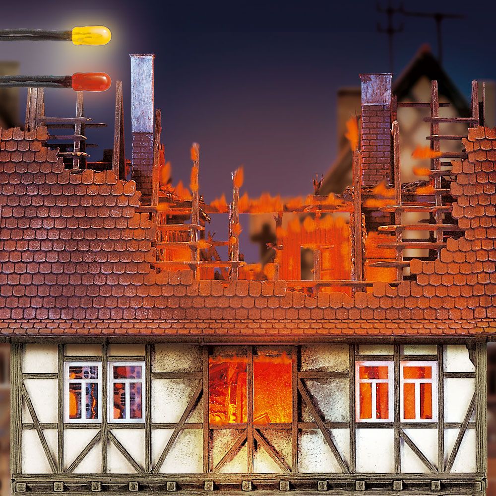 Zum Einbau in »brennende« Häuser, als Lagerfeuer usw. Eine rote und eine gelbe Glühlampe werden durch die mitgelieferte Elektronikschaltung unregelmäßig angesteuert, so dass sich ein flackerndes Brandleuchten ergibt.