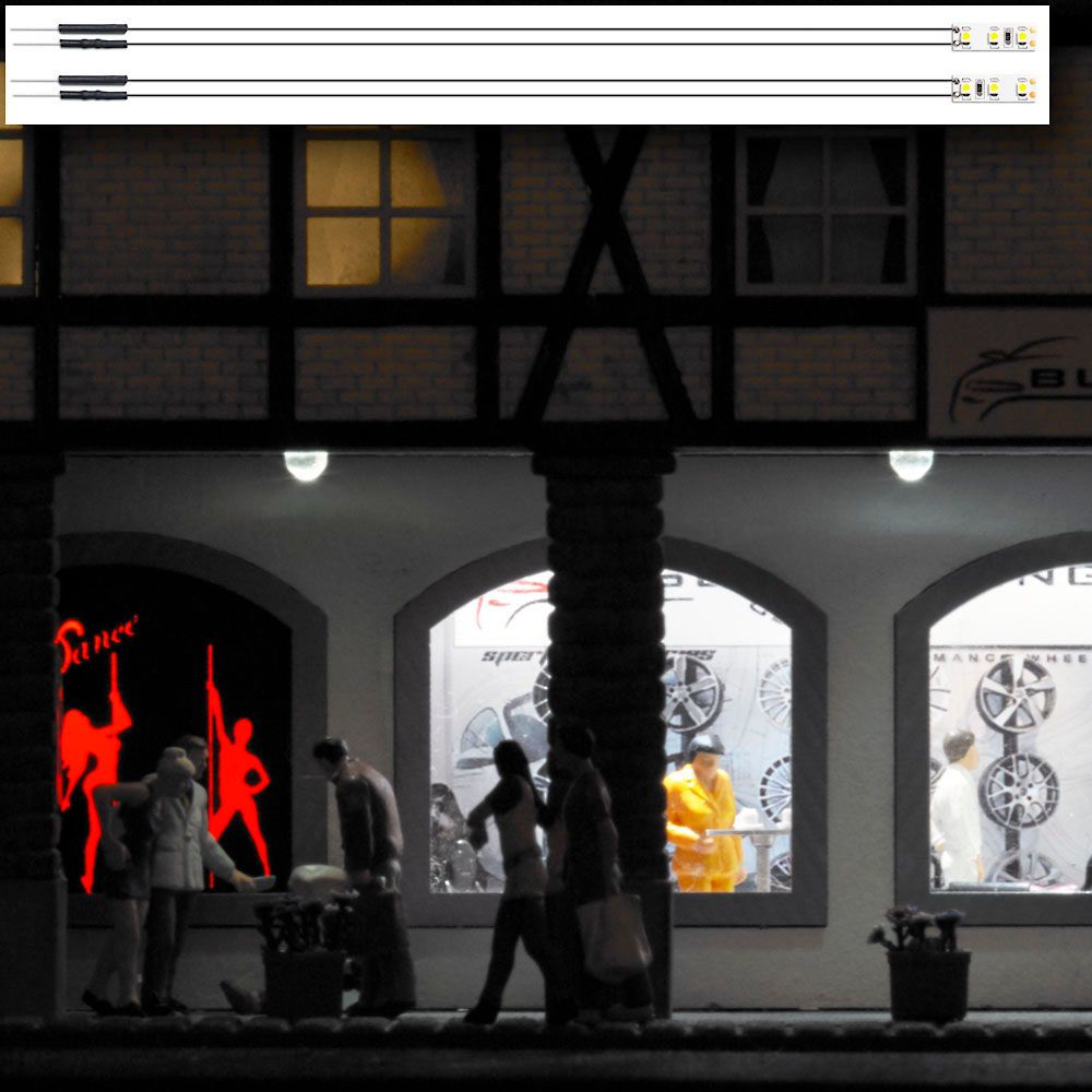 Für die Beleuchtung von Häusern und Fahrzeugen. Fertig zum Anschluss an 14-16 V Gleich- oder Wechselspannung. Durch kompakte Bauweise (24 x 8 mm) universell einsetzbar. Jeder Leuchtstreifen hat 3 warmweiß leuchtende LEDs. Einfach zu befestigen durch Selbstklebefolie auf der Rückseite.