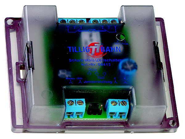 Schaltrelais/Zeitschalter ersetzt die mechanischen Bausteine Relais und Zeitschalter, Art.-Nr.: 08410 und 08420, durch eine moderne elektronische Lösung. Die Besonderheit liegt darin, daß die Relais- und Zeitschalterfunktion in einem Modul integriert sind und über einen "Jumper" vom Anwender gesteckt wird. Im Unterschied zu den Vorgängerbausteinen wird hier eine separate Stromversorgung benötigt, die aus jedem Zubehörtrafo (12 ... 16 V) entnommen werden kann. Das Modul verfügt über zwei potentialfrei verwendbare Wechselkontakte mit einer maximalen Strombelastbarkeit von je 1 A. Die Steuereingänge "E" und "A" sind kurzschlußsicher beschalten, so daß nahezu jedes Steuersignal im Bereich von -16 V bis ca. +0,5 V zum Schalten führt. Sie sind auch zwischen mehreren Relaismodulen untereinander verschaltbar. Auf dem Modul befindet sich ein Stellpotentiometer, über das die Schaltverzögerung eingestellt wird (ca. 2 s bis ca. 5 min) Eine LED signalisiert den Schaltzustand "Relais aus". Nach dem Bereitstellen der Versorgungsspannung geht das Modul automatisch in diese Vorzugsstellung (LED an).