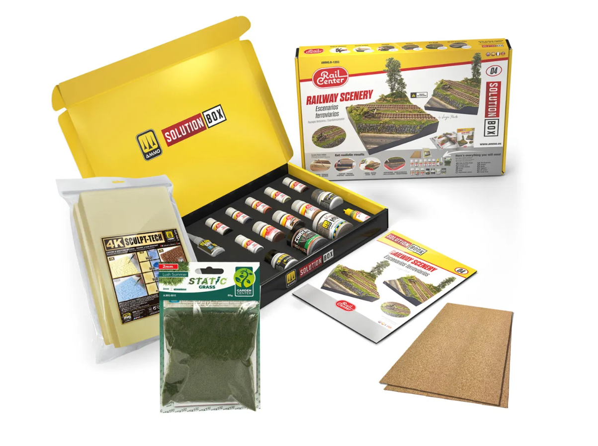 Die Solution-Box „Realistischer Landschaftsbau“ ist ein komplettes Set, das Modellbauern alles bietet, um detailgetreue Landschaften für Modellbahnen oder Dioramen zu gestalten. In Zusammenarbeit mit AMMO Rail Center entwickelt, enthält das Set perfekt aufeinander abgestimmte Farben, Washes, Pigmente, Texturen, Gräser, Streumaterial, Bodeneffekte, Korkplatten für Gleisbett und Unterbau sowie hochwertigen Modellbaukleber. Ergänzt wird der Inhalt durch ein reich bebildertes Anleitungsheft, das Schritt für Schritt erklärt, wie realistische Szenerien entstehen – von der Schotterung der Gleise über authentische Alterungstechniken bis hin zur feinen Begrünung. Alles, was Sie benötigen, ist bereits enthalten, sodass Sie sofort mit Ihrem Projekt starten können. Die hochwertige Materialauswahl sorgt für professionelle Ergebnisse, die sowohl Einsteiger als auch erfahrene Modellbauer überzeugen, und ist mit verschiedenen Spurweiten wie H0, TT und N kompatibel.