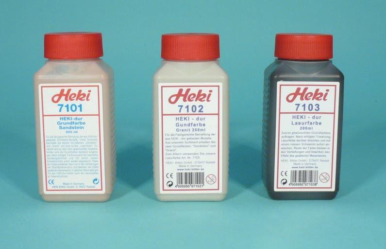Heki dur Modelle erhalten Ihr finish durch die farbliche Gestaltung mit Heki dur Farben. Sie erhalten die beiden Grundfarben "Sandstein" und "Granit'" und iene dunkle "Lasurfarbe". Zunächst wird je nach gewünschtem Farbton eine der Grundfarben deckend aufgetragen. Nachdem der Grundanstrich getrockne ist, wird alles mit Lasurfarbe überstrichen und mit einem nassen Schwamm sofort wieder abgewischt. Farbreste der Lasur bleiben dabei nur in den Vertiefungen und bewirken den Effekt gealterten Mauerwerks. In gleicher Vorgehensweise gelinen durch die Heki dur Farben auch die Lasurarbeiten an Gebirgen.