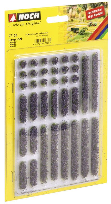 Anlass genug für NOCH, dem Spezialisten für Modell-Landschaftsbau, diese so typischen Felder im Modell nach zu empfinden. Den Lavendel von NOCH gibt es als einzelne Büschel oder als Streifen deren Spitzen mit feinen blau-violettem Flock veredelt werden. Diese Veredelung veleiht dem Lavendel seinen typischen Charakter.
